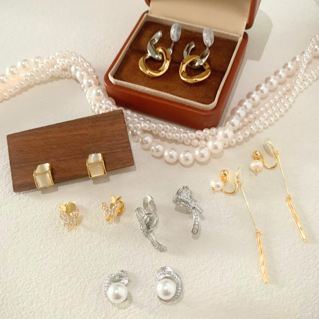 バタフライ&パールイヤリング【ノンホール(フラットタイプ)】