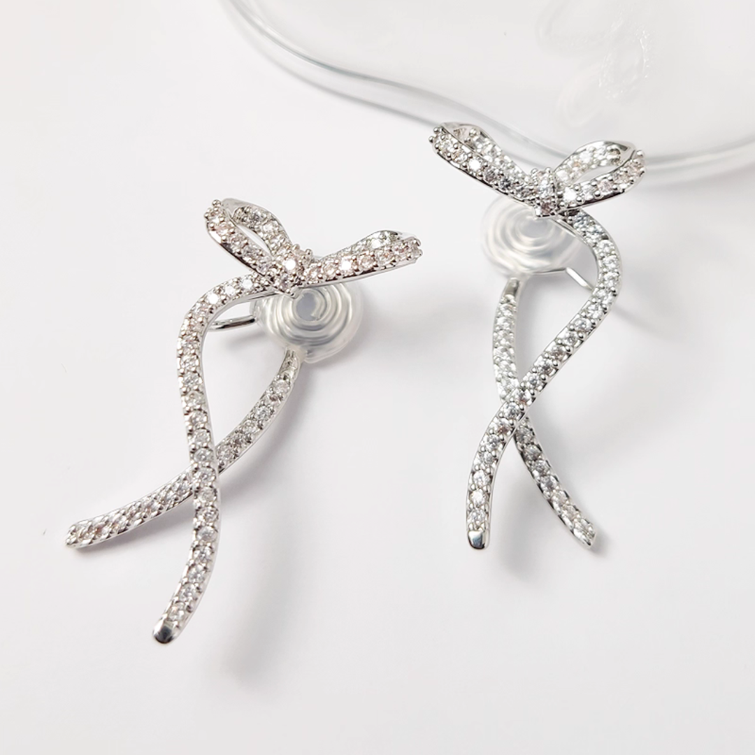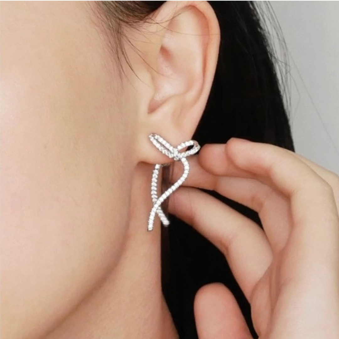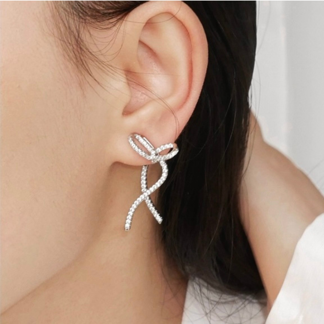 上品にきらめくラインが耳元で美しくカーブを描く、リボンモチーフのイヤリングです。