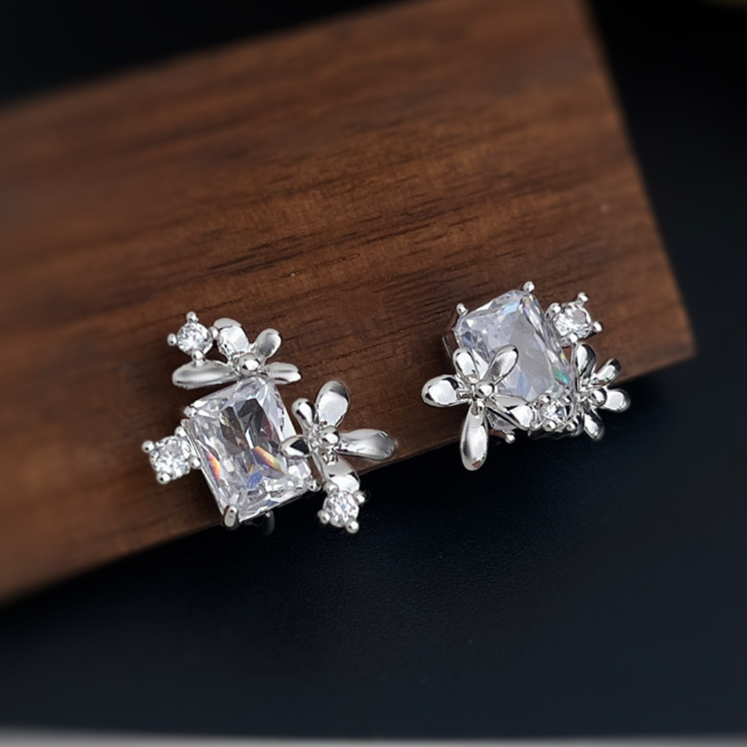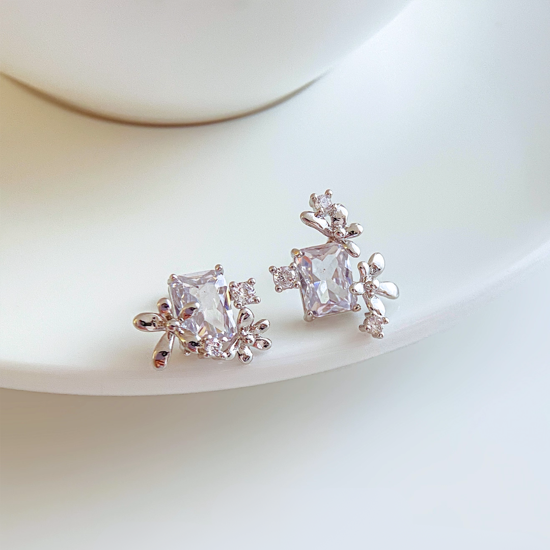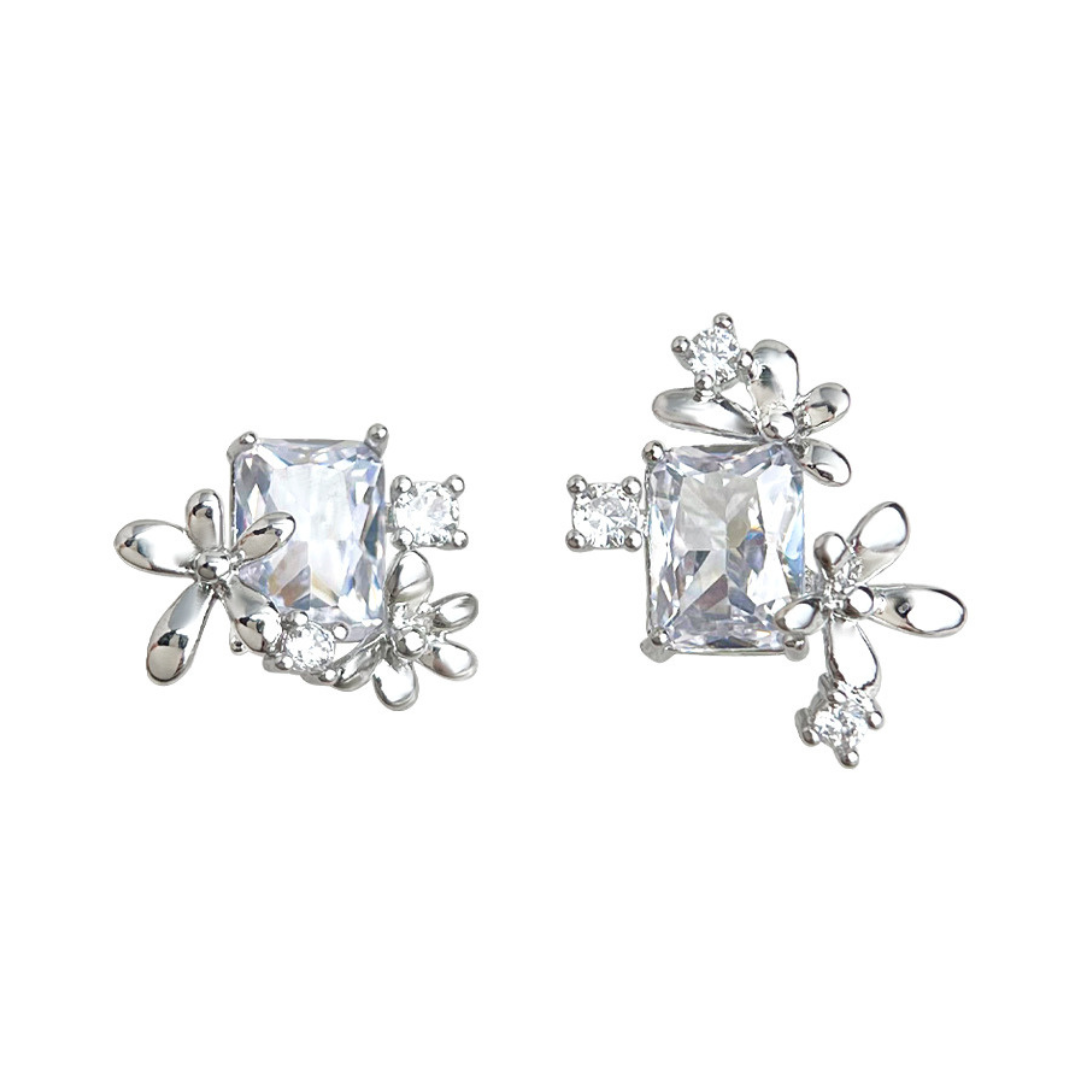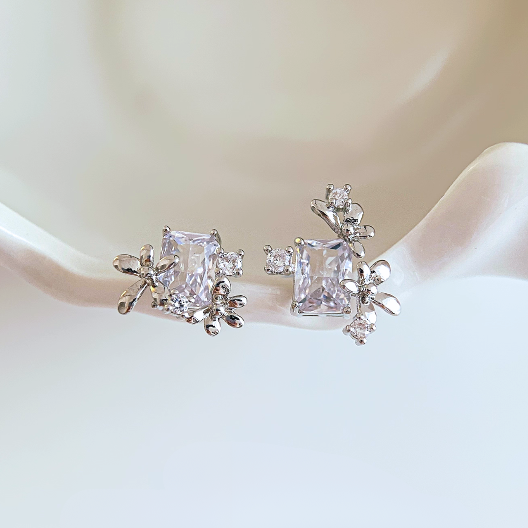 大粒のスクエアビジューを中心に、可憐な小花モチーフが寄り添う、アシンメトリーデザインのイヤリング。