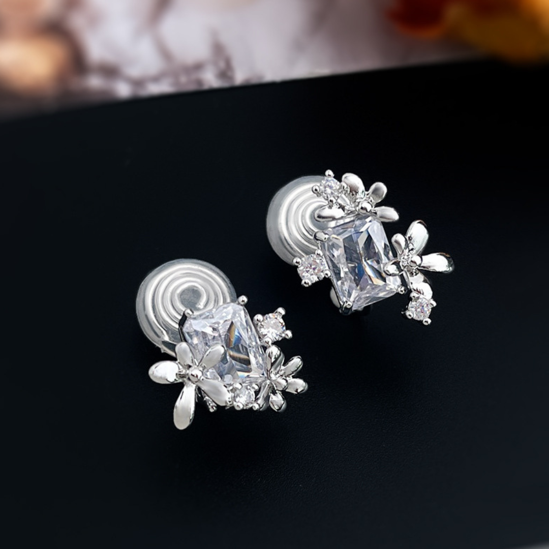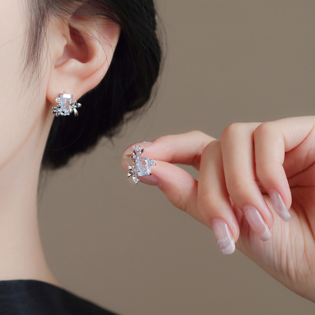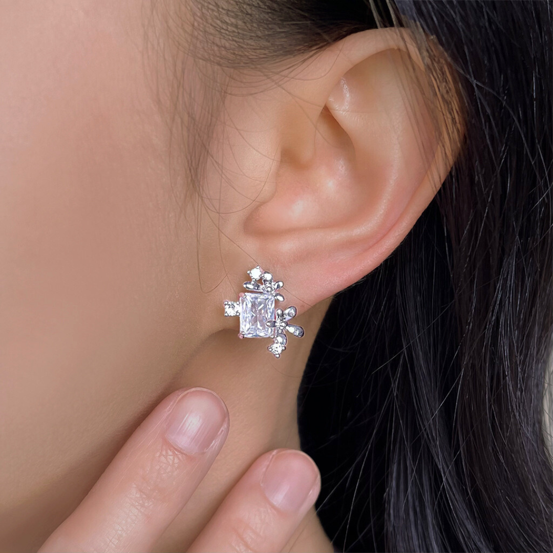 左右で異なる花の配置が、横顔に遊び心と動きのある表情をプラス。光を受けるたびに、ジルコンと小花が繊細にきらめきます。 凛としたスクエアカットの輝きと、柔らかな小花のデザインが絶妙に融合し、上品ながらも個性的な印象を演出。 お呼ばれやパーティーシーンはもちろん、シンプルなトップスに合わせて、普段のコーディネートをセンスアップしたい時にも最適です。