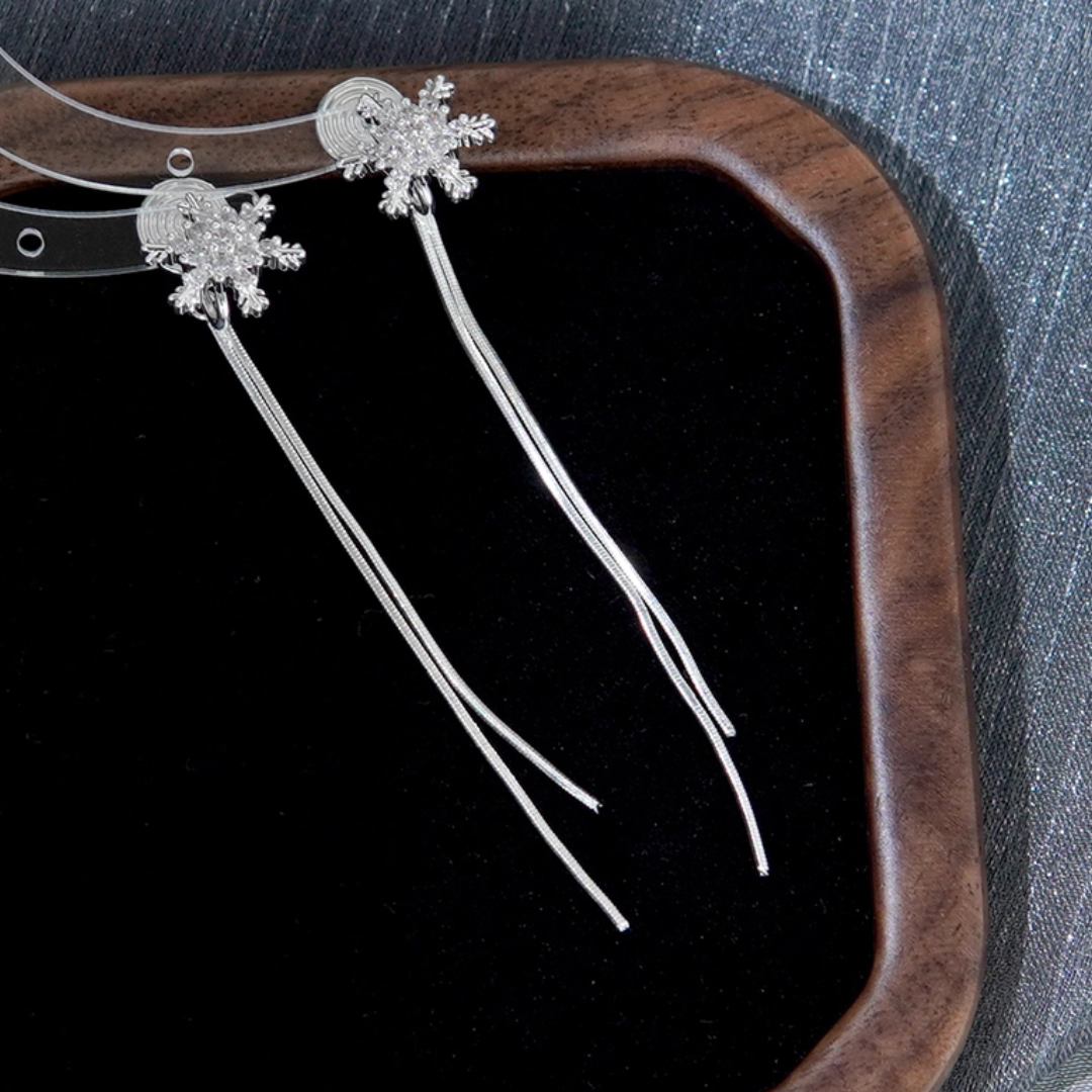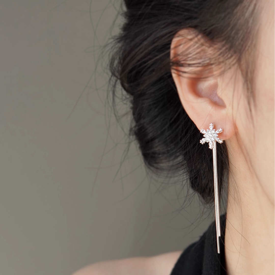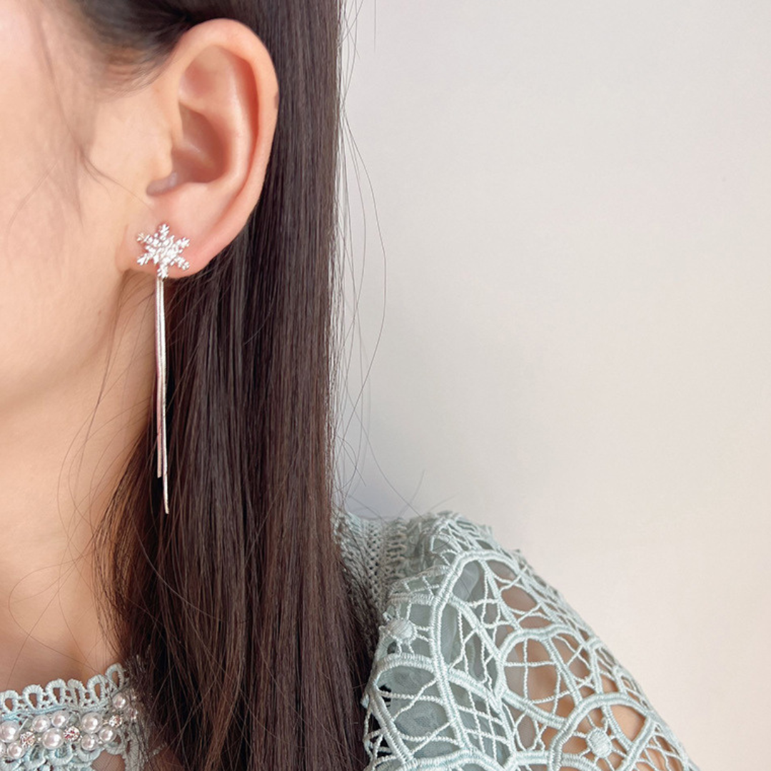 耳元できらめく雪の結晶から、繊細なスネークチェーンがしなやかに揺れるイヤリング。