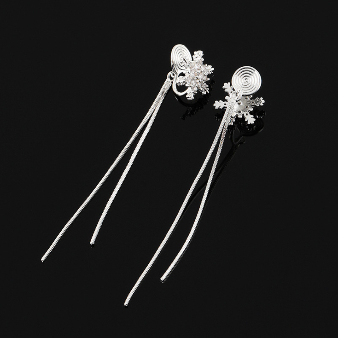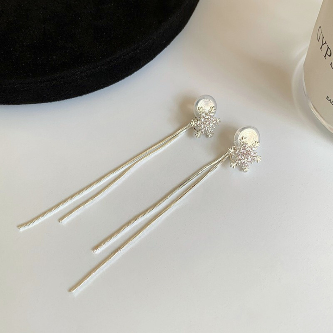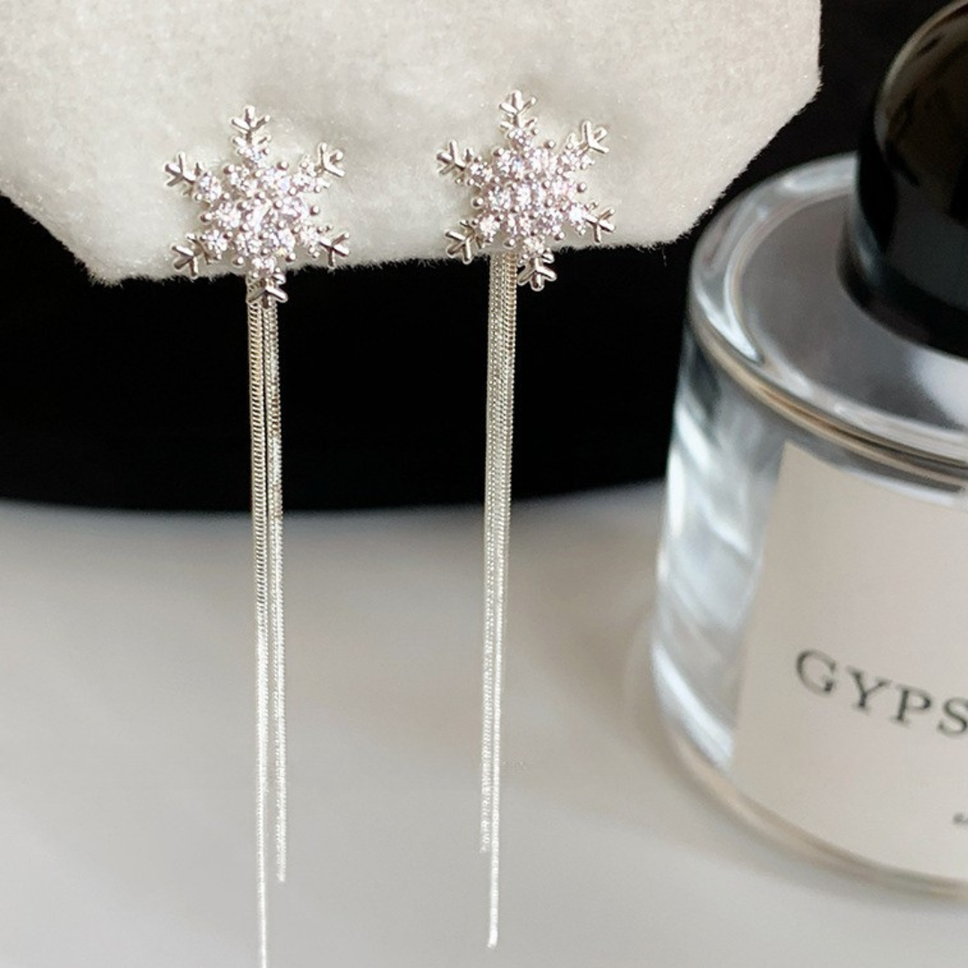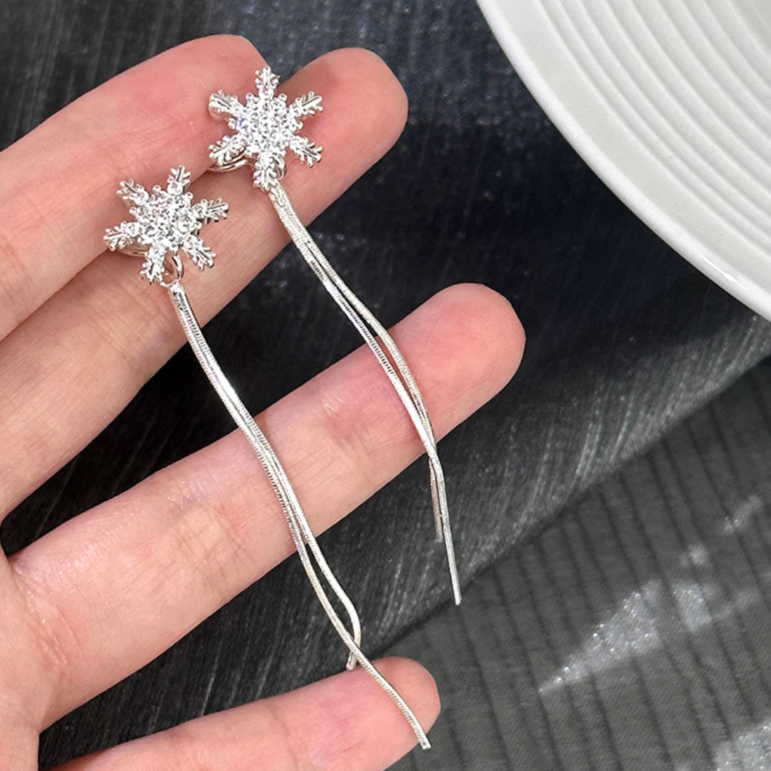 耳元できらめく雪の結晶から、繊細なスネークチェーンがしなやかに揺れるイヤリング。