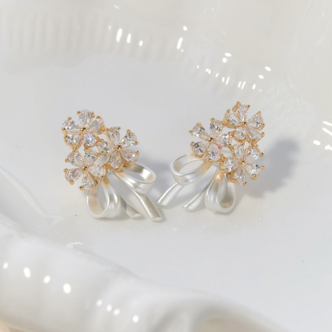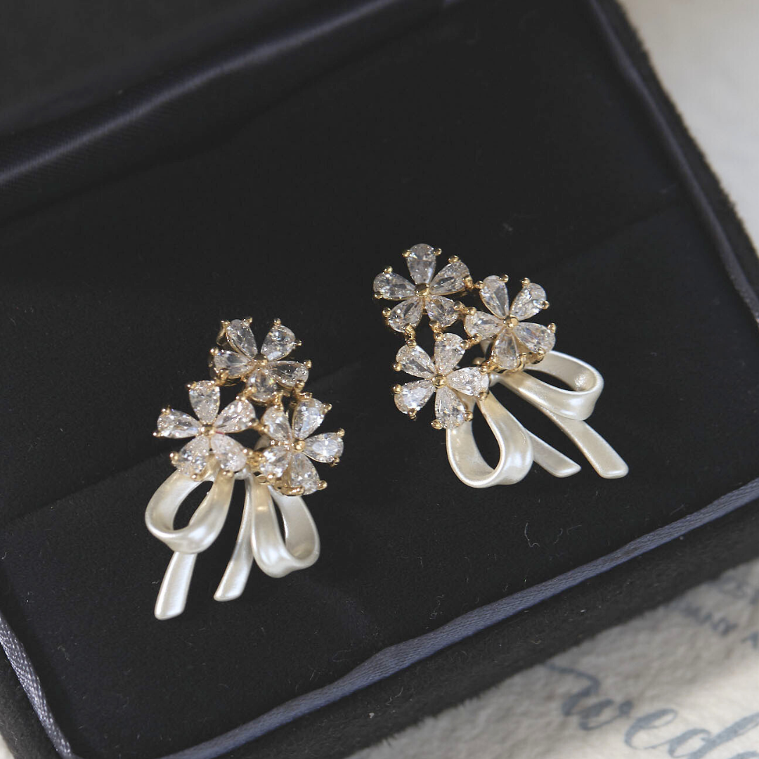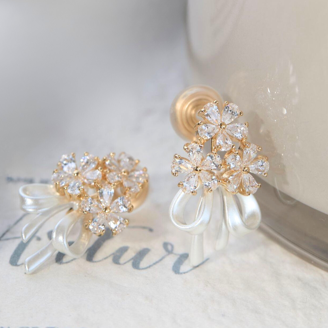 きらめくビジューの小花を、上品なリボンで束ねた、花束のようなイヤリング。