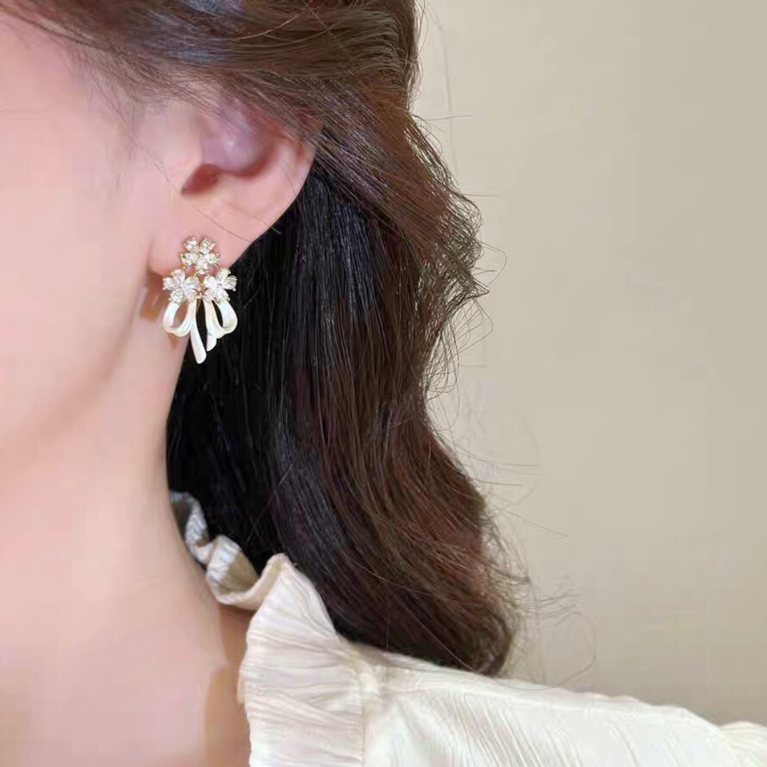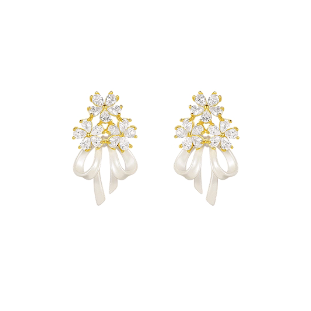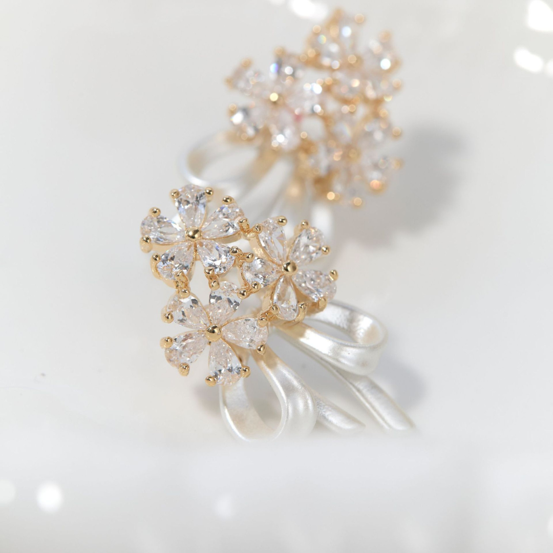 きらめくビジューの小花を、上品なリボンで束ねた、花束のようなイヤリング。
