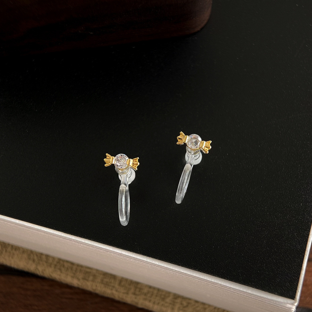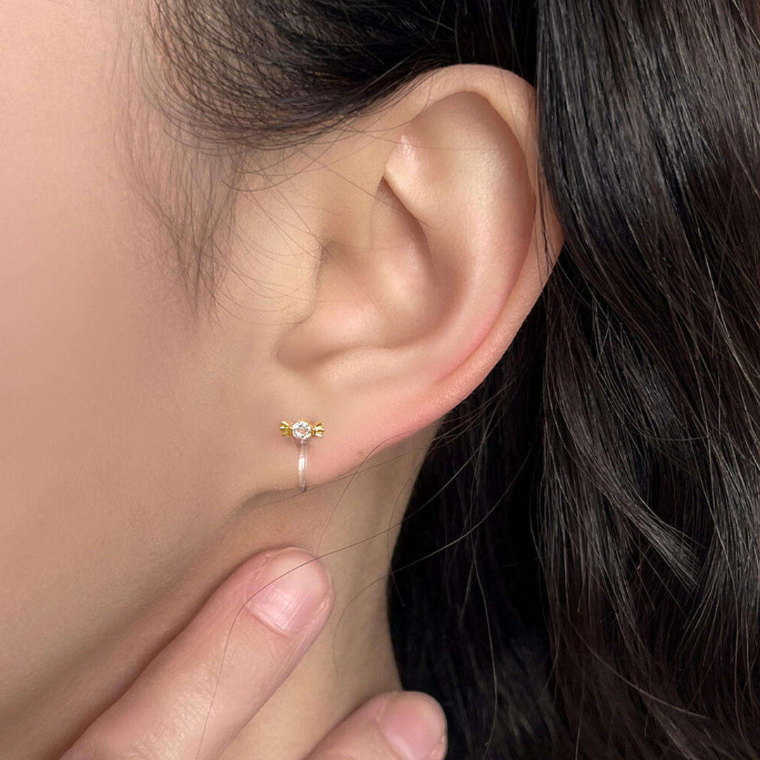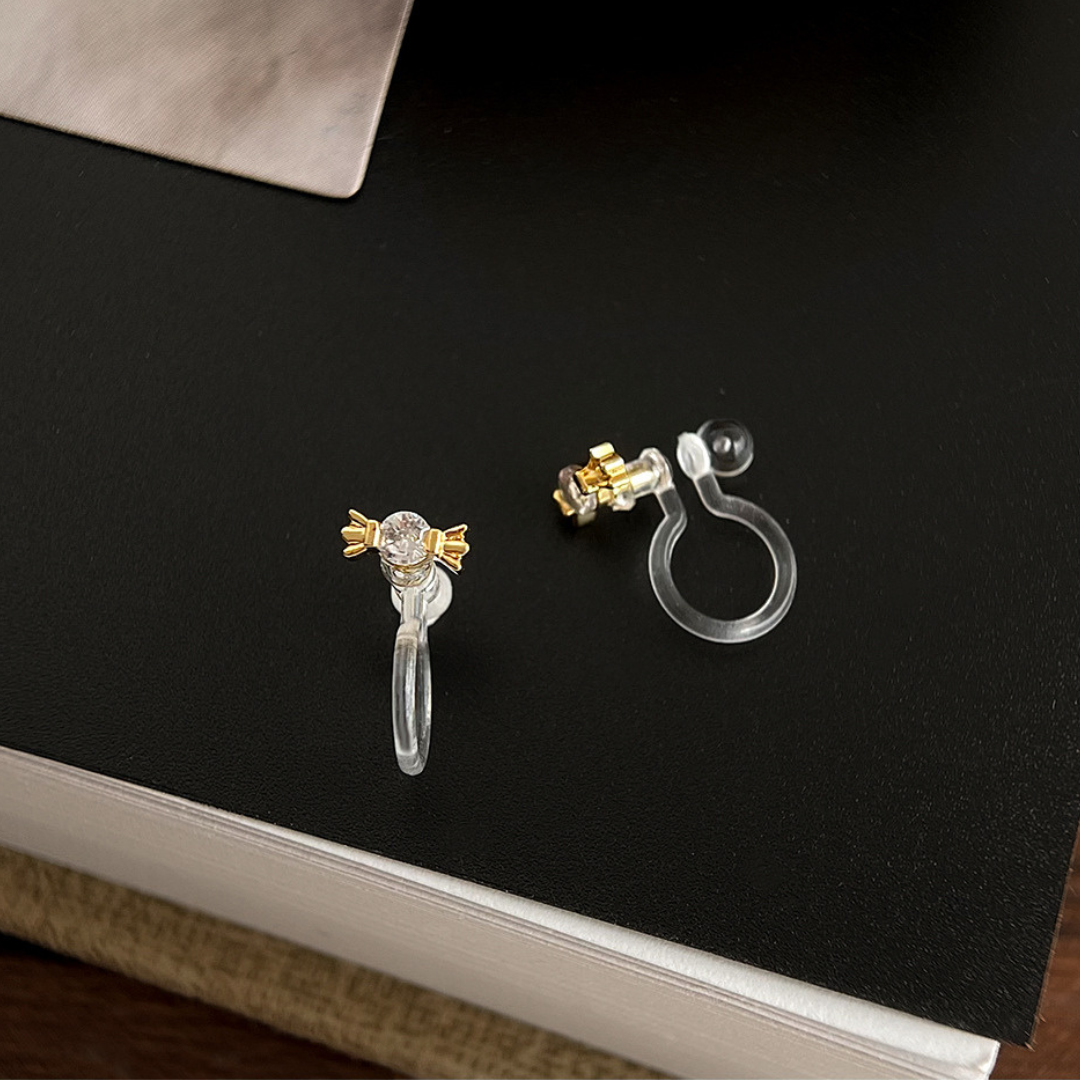 中央できらりと輝く一粒ビジューを、小さなリボンでキュッと包んだ、遊び心あふれるデザインです。 耳を挟む部分は透明な樹脂製なので、まるで本物のピアスを着けているように見えるのが嬉しいポイント!軽くて痛くなりにくく、ピアスホールがなくても気軽に楽しめます。