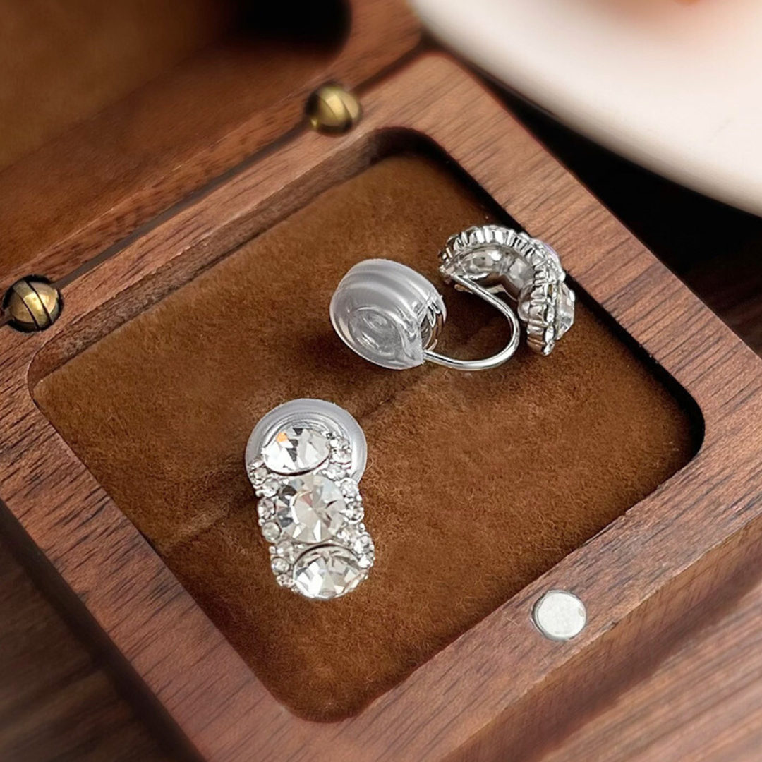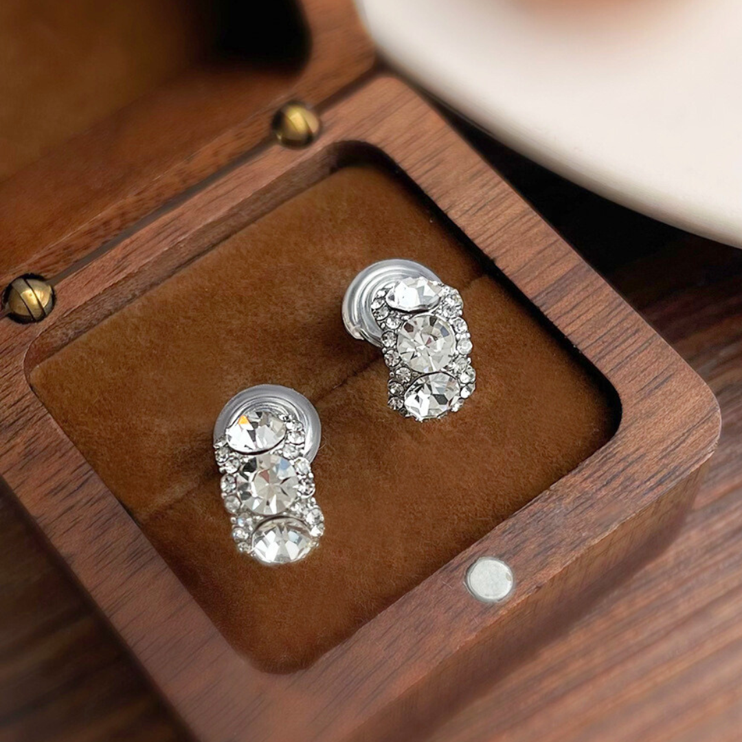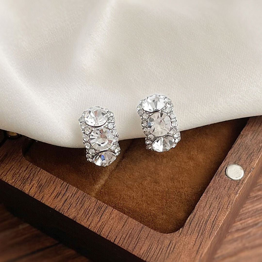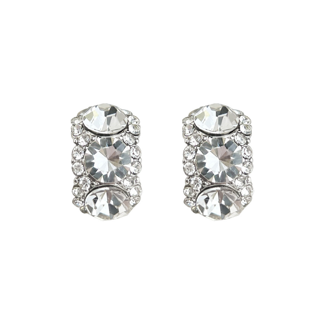 縦に並んだ3粒の大粒ビジューが主役の、ゴージャスで存在感抜群なイヤリング!