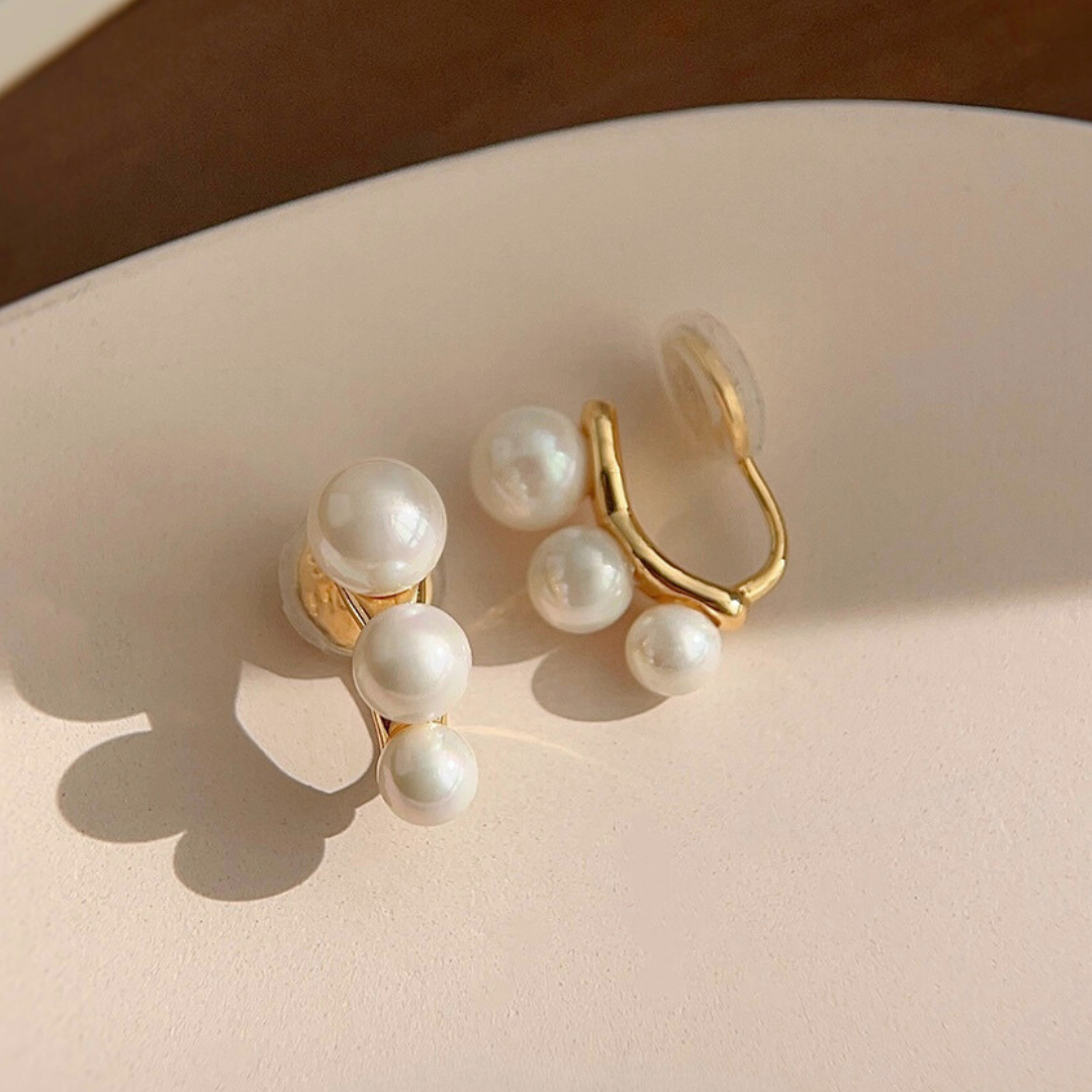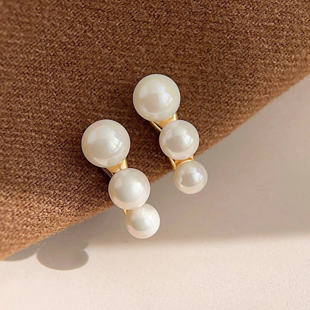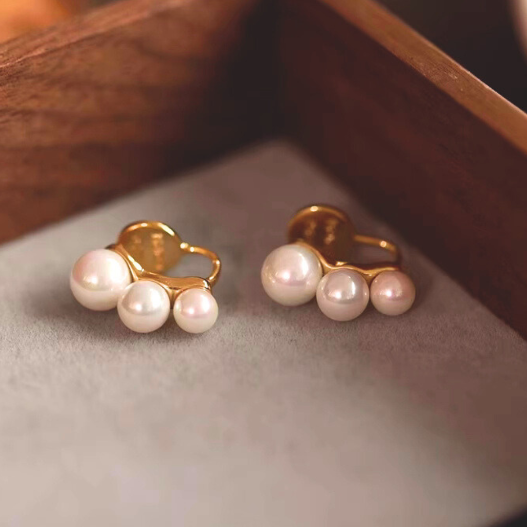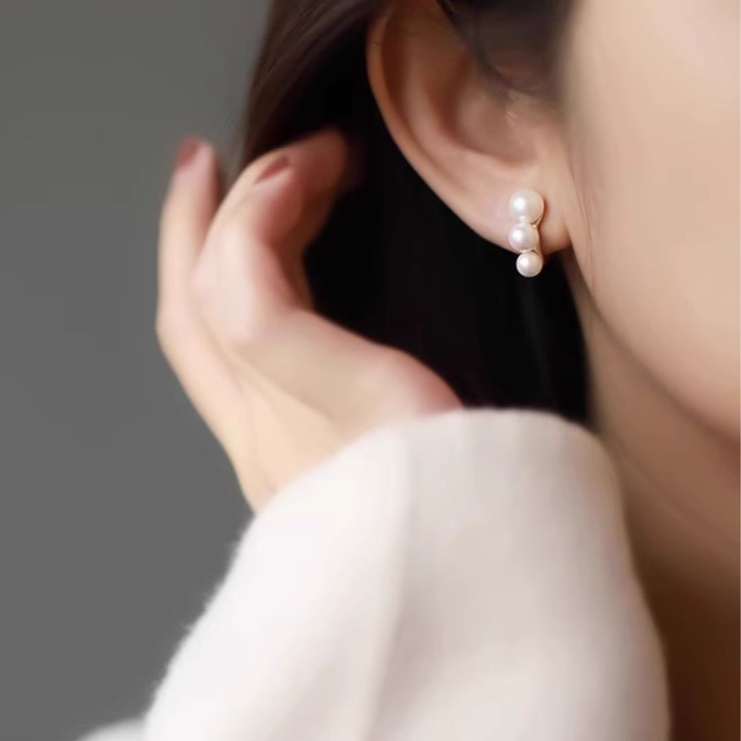 大きさの異なる3粒のパールを、リズミカルに並べたイヤリング。