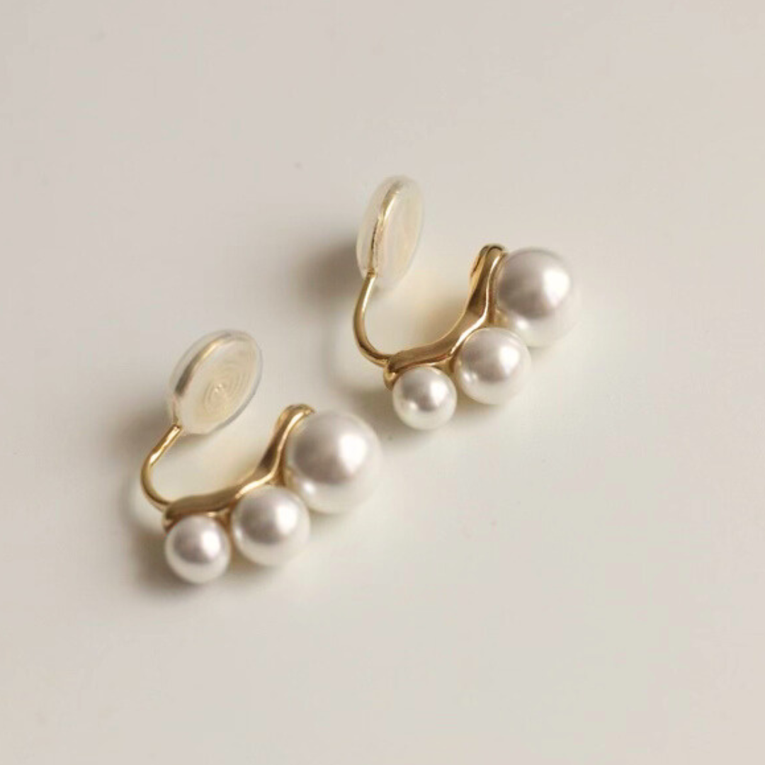 艶やかなパールが耳元に寄り添い、顔まわりに上品で柔らかな光を添えます。 小ぶりながらも立体感のあるシルエットが、さりげなく女性らしい横顔を演出。 耳に優しいクリップ式で、まるで着けているのを忘れるほど軽やかな着け心地です。