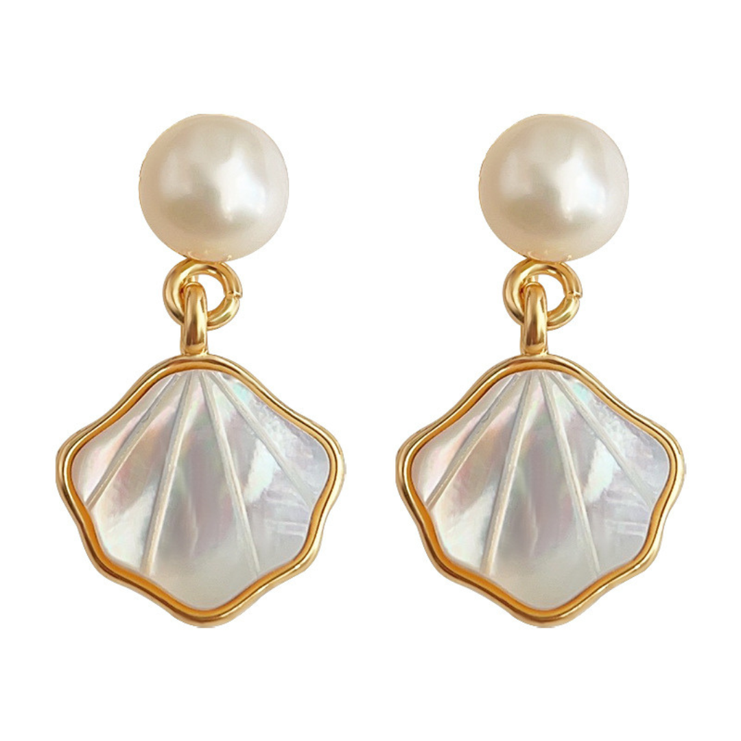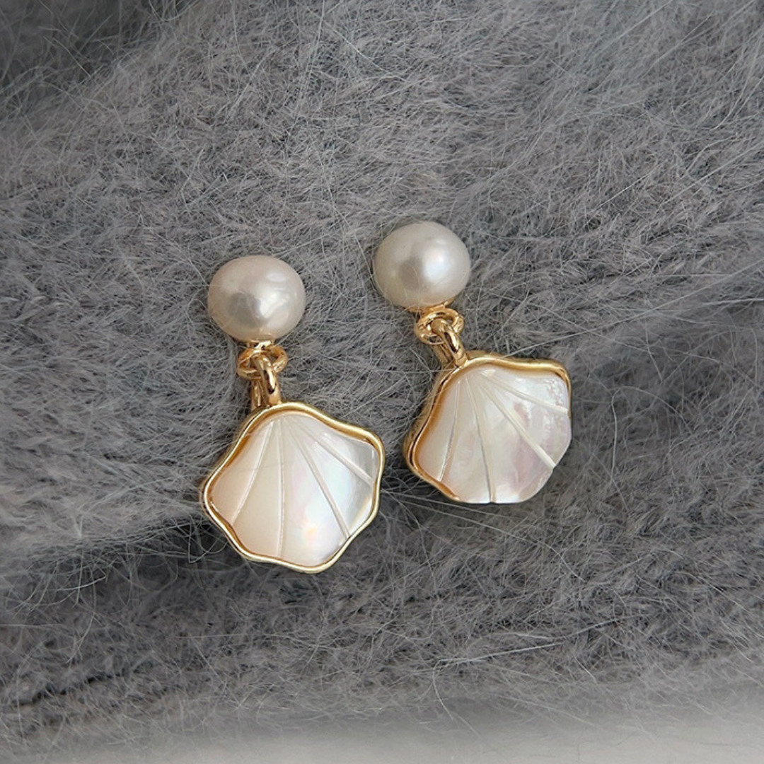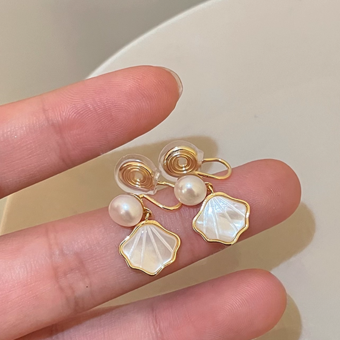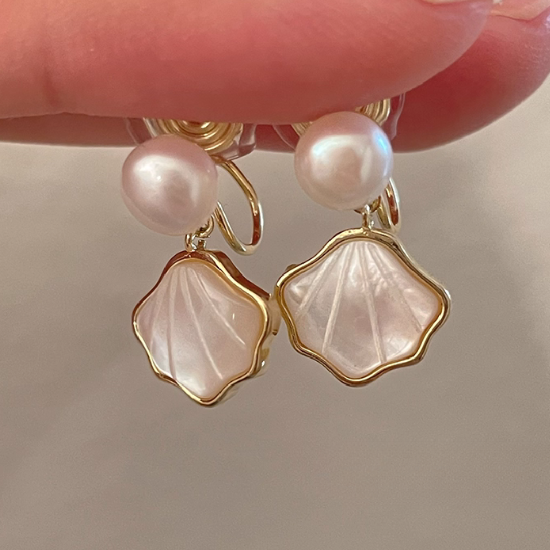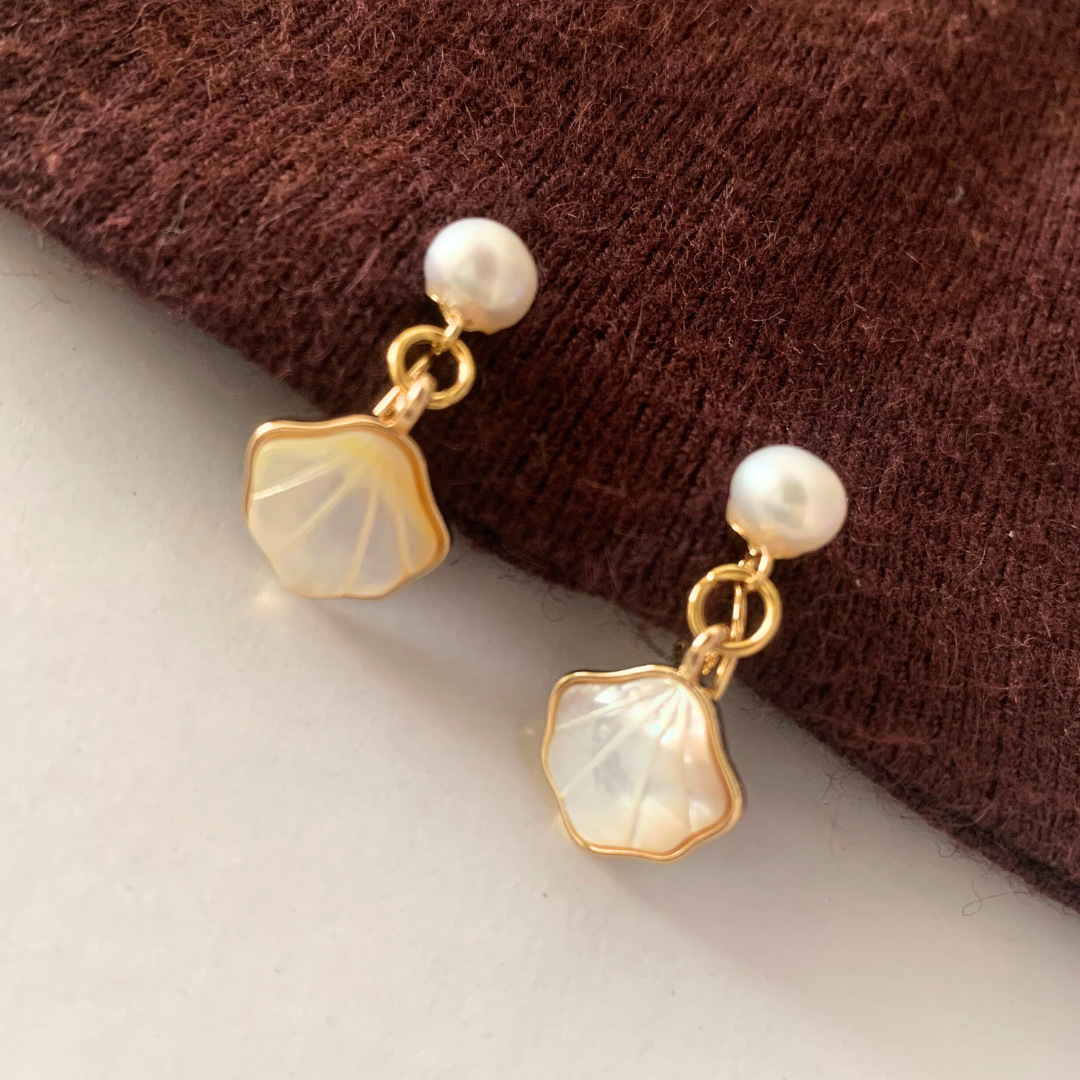 上品な淡水パールと、柔らかく輝くシェルモチーフを組み合わせたデザインイヤリング。